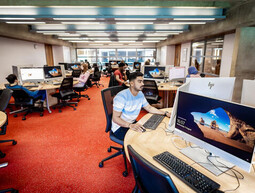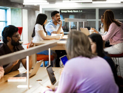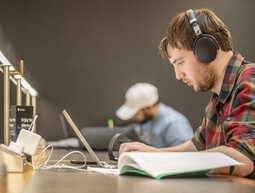 Interior spaces of the David Wilson Library, including student group and solo study.